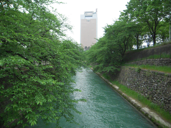 桜の葉が新緑に燃え、滔々と流れる水路は