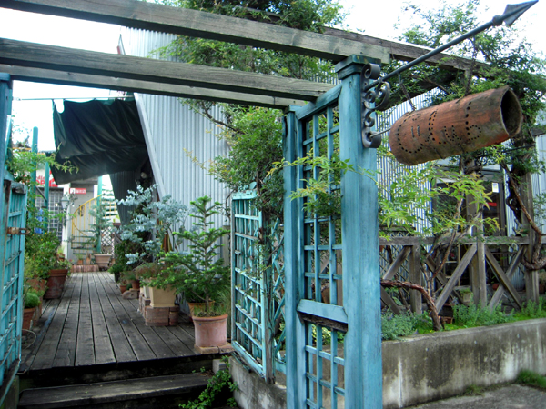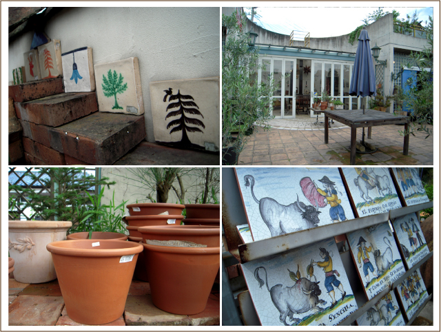 お店のお庭にはヨーロッパのアンティークタイルやテラコッタポット
